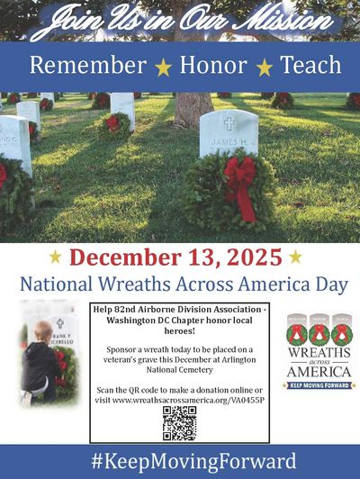Join the 82nd Airborne Division Association – Washington DC Chapter in supporting National Wreaths Across America Day, taking place Saturday, December 13, 2025, at Arlington National Cemetery.